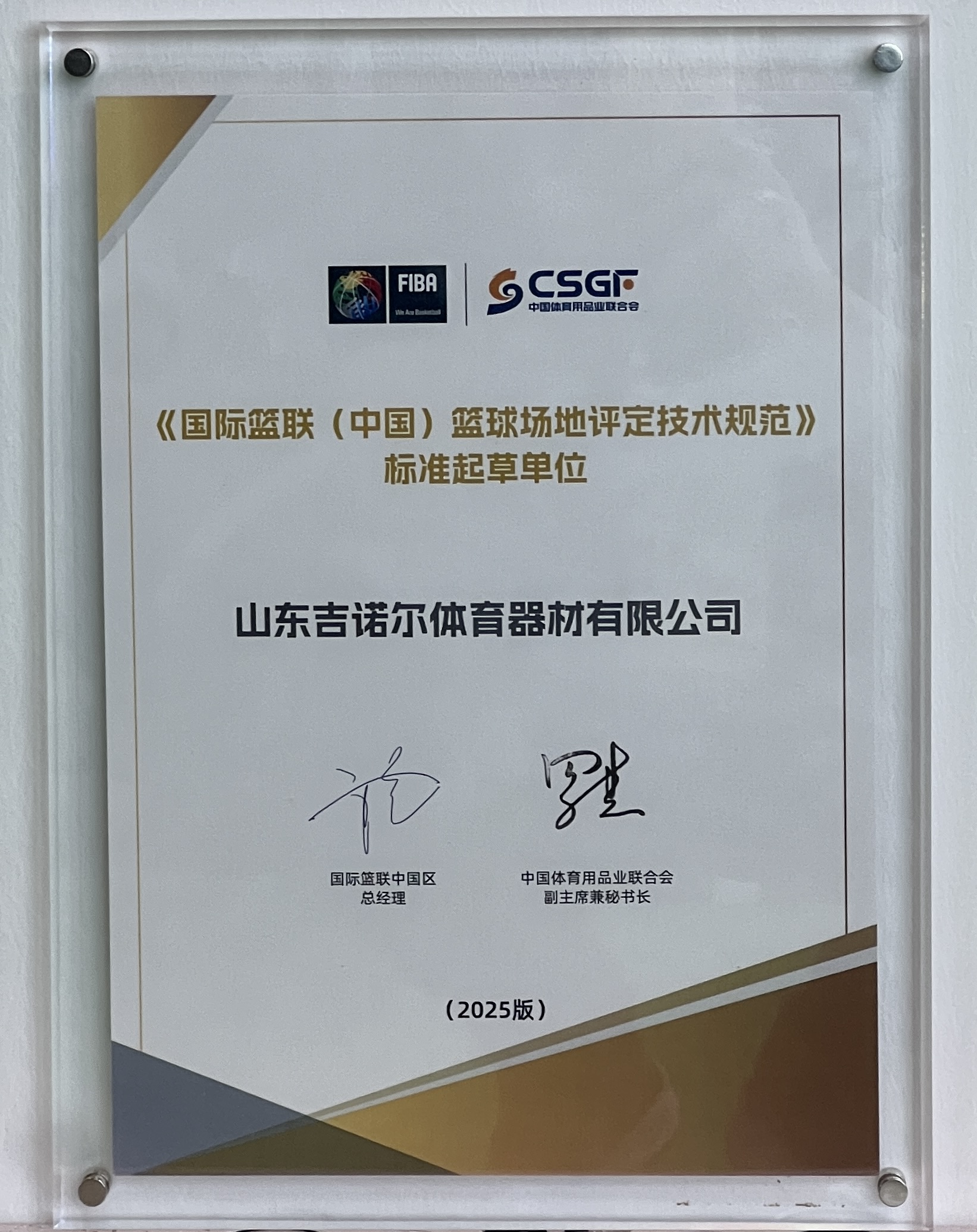中国体育用品业联合会×国际篮联(中国)签约仪式及获证机构授牌仪式在展会现场圆满举行。吉诺尔作为《国际篮联(中国)篮球场地评定技术规范》起草单位之一,被授予荣誉牌匾。